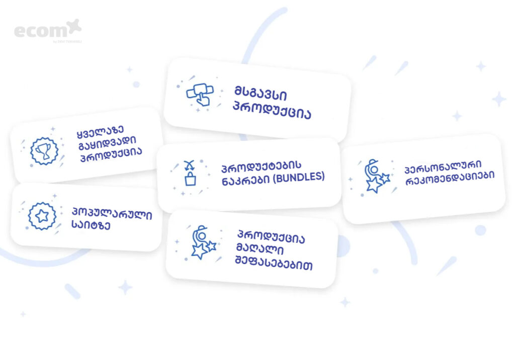 - მაგალითი: „ამ ნივთთან ერთად ყიდულობენ“ — ეფუძნება გაყიდვების სტატისტიკას.